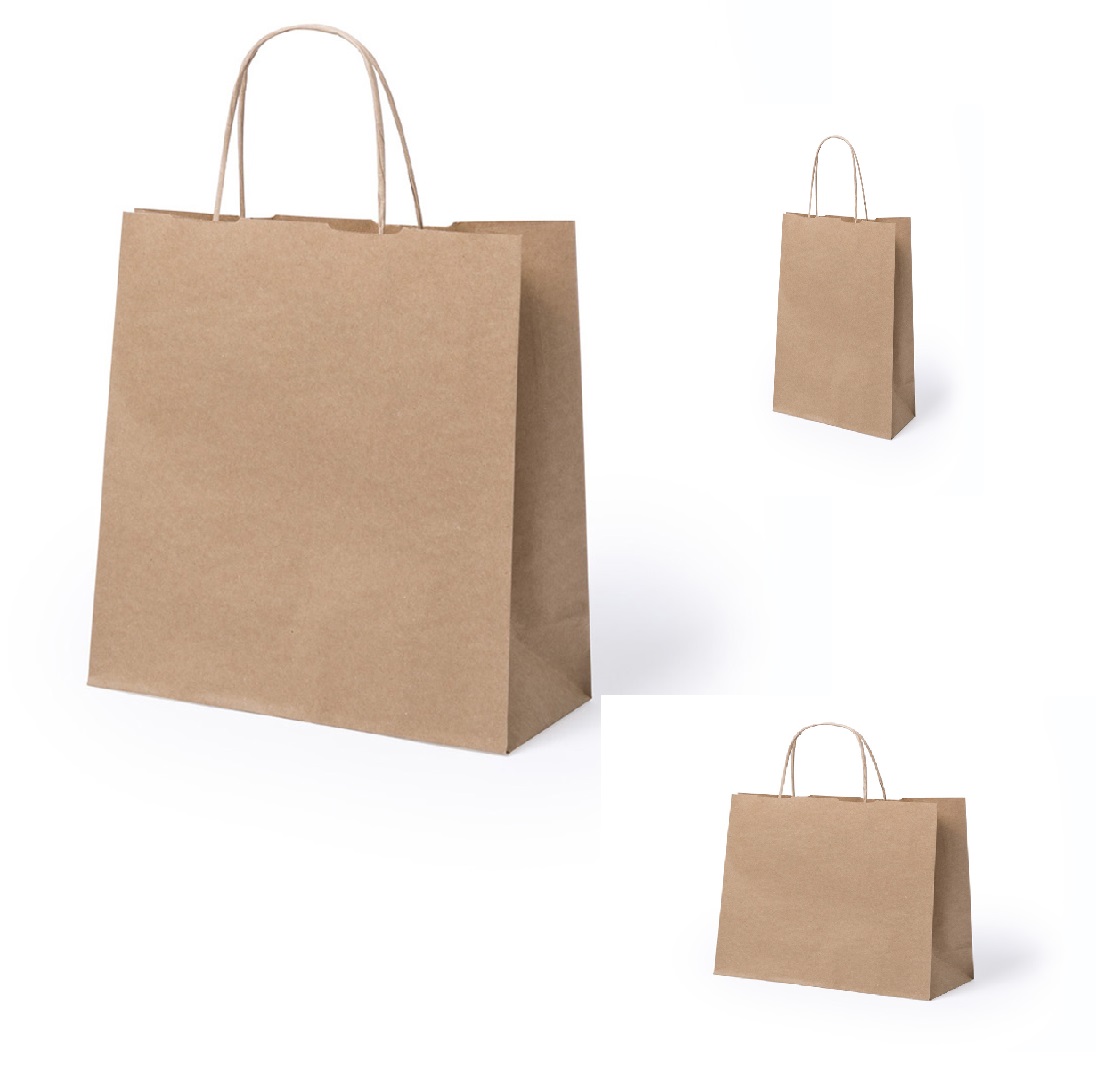 Bolsa en papel de acabado natural de 100g/m2 con asas cortas reforzadas y fuelle. Resistencia hasta 7kg de peso.